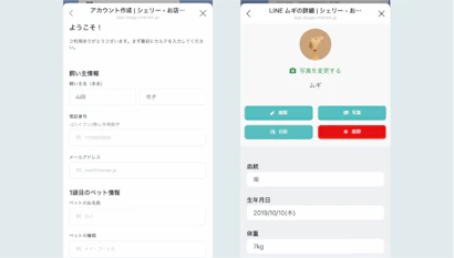 ペットホテルやトリミングサロンなど、ペットを対象とするサービスでは、ペットの基本情報を正確に管理することが重要です。シェリービジネスポータルでは、ペットの名前、品種、年齢、体重、健康状態、アレルギー情報など、必要な基本情報を簡単に登録できる機能を提供しています。直感的な操作で、初めてのスタッフでも迷わず入力可能です。