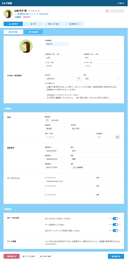 顧客ごとに異なる重要な情報を確実に管理することは、信頼されるサービスには欠かせません。シェリービジネスポータルの電子カルテ機能では、基本メモ欄を活用して、お客様に関する重要な情報を簡単に記録・共有できます。たとえば、特定のリクエストや注意事項、アレルギー情報などを記録しておけば、スタッフ全員がすぐに確認でき、ミスのない対応が可能です。