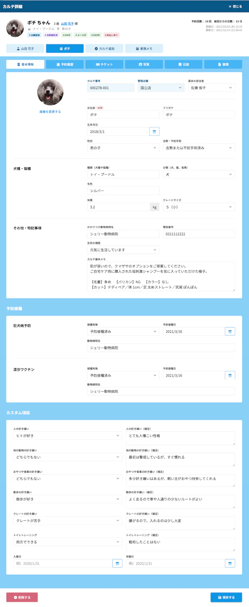 たとえば、ペットホテルなら「クレートに入れられるのかどうか」「トイレのタイミングはいつどこなのか」といった情報をカスタム項目に入力することで、顧客やペットに合わせた対応が実現します。これにより、サービスの質が向上し、特にリピート利用時にその威力を実感できるでしょう。