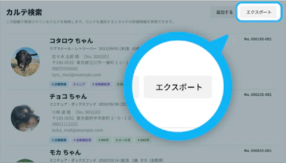カルテ検索画面から「エクスポート」を押すとカルテデータをダウンロードすることができます。全データをダウンロードすることもできますし、検索画面で条件を絞ってダウンロードすることもできます。例えば「DM送付可」で絞ってダウンロードし、送付先リスト作成にお使いいただくこともできます。