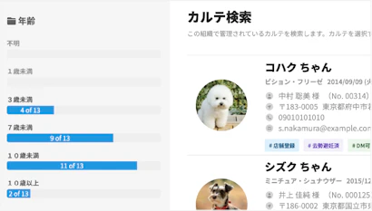 顧客(お客様)とカルテ(ペット)、性格や特性の記録、施術やトレーニング内容の記録に至るまで、すぐに検索して表示。来店回数なども即座に表示できるので、スピード感のあるきめ細かいサービス提供に役立ちます。